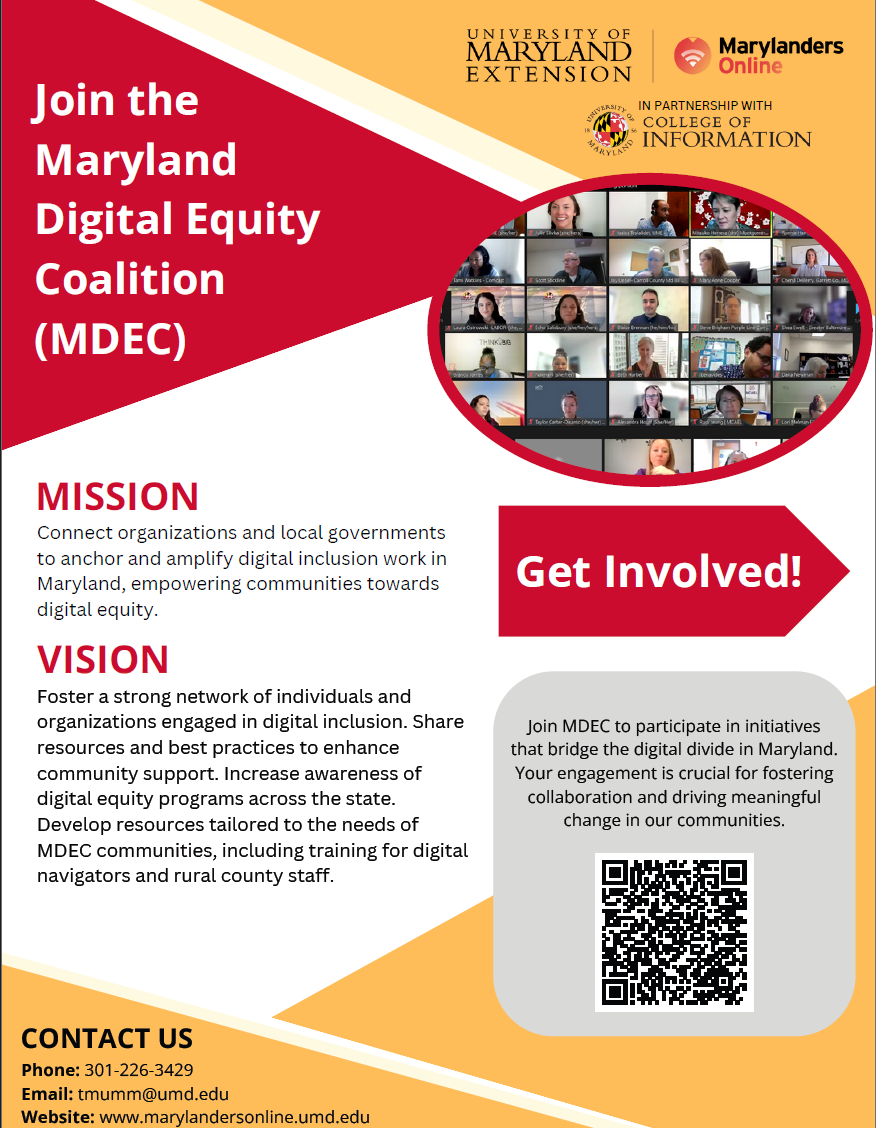 The Maryland Digital Equity Coalition (MDEC) is a statewide digital equity partnership network composed of a diverse group of stakeholders, including state and local government agencies, public libraries, healthcare providers, senior centers, schools, non-profits, and community leaders. Learn more about Maryland's digital progress here.